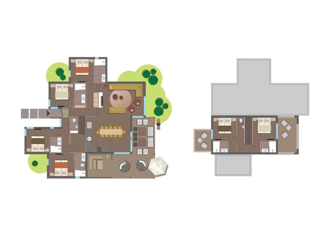 חדר רחצה צמוד לכל חדר שינה. שני חדרי רחצה אחד עם כיור ומקלחון גשם ושירותים. ארבעה חדרי רחצה עם כיור ומקלחון, שירותים נפרדים.