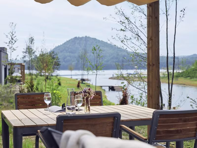 מרפסת פרטית עם חזית למים, ריהוט גן, כסאות נוח וברביקיו (מנגל).