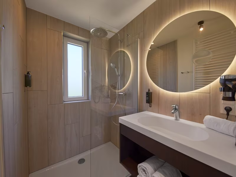חדר רחצה צמוד לכל חדר שינה. חדר רחצה אחד עם כיור ומקלחון גשם, חדר רחצה אחד עם כיור ומקלחון עם מושב מקלחת ומעקה תמיכה, שירותים מותאמים עם מעקה תמיכה.