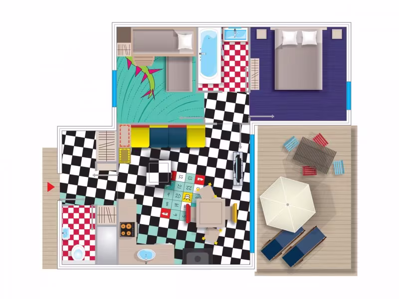 2 חדרי שינה: חדר שינה אחד עם מיטה כפולה וחדר שינה נוסף עם מיטת קומותיים (המיטה העליונה אינה מתאימה לילדים מתחת לגיל 6).