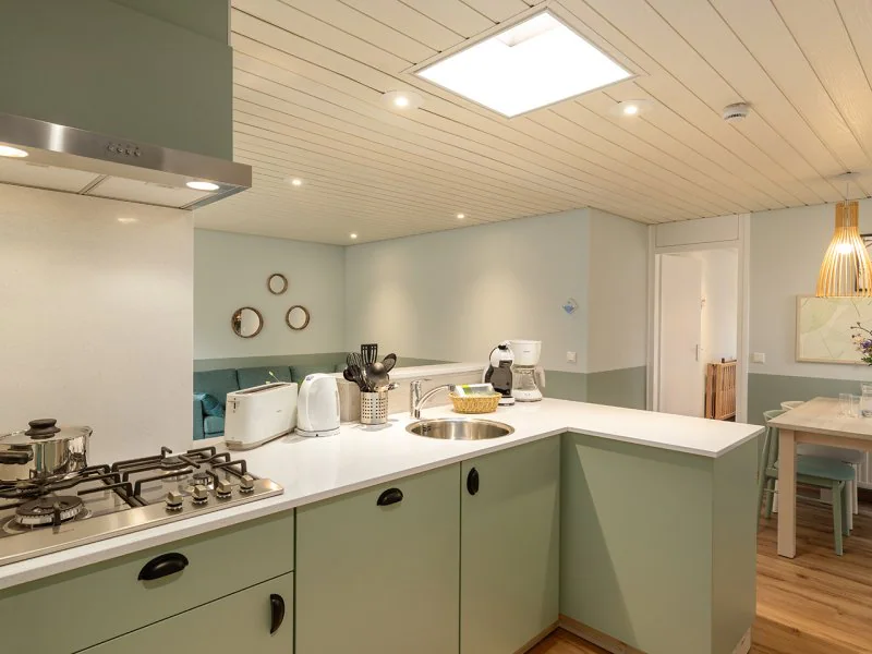 מטבח מחודש ומאובזר עם כיריים, מקרר, מדיח כלים, מיקרוגל, מכונת קפה, טוסטר, NESCAFE DOLCE GUSTO, סכו"ם, מחבתות, סירים, צלחות וכיסא גבוה.