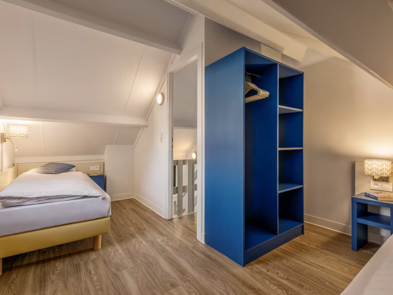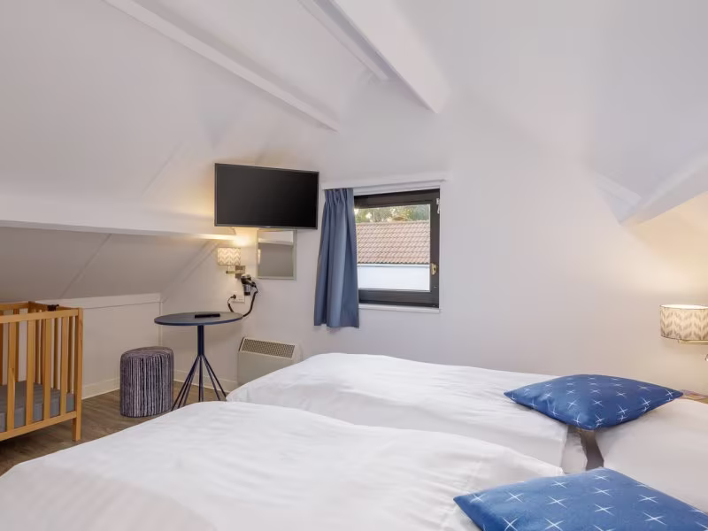 שלושה חדרי שינה: חדר שינה אחד עם שתי מיטות יחיד צמודות וטלוויזיה נוספת בחדר, חדר שינה אחד עם שתי מיטות יחיד נפרדות, וחדר שינה אחד עם מיטת יחיד.
