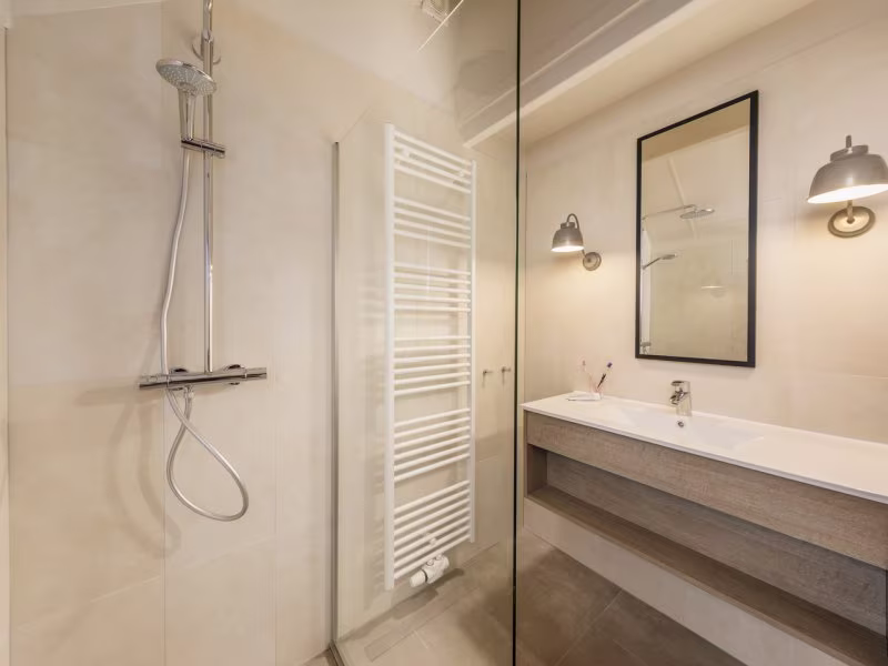 חדר רחצה אחד עם מקלחון מקלחת גשם, כיור, מייבש שיער, שירותים נפרדים.