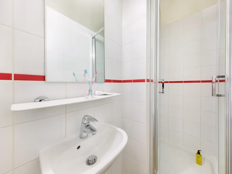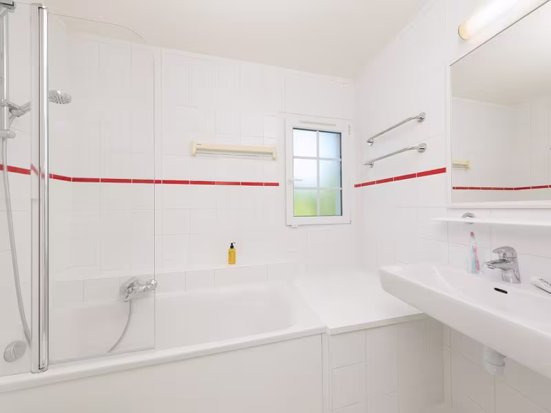 2 חדרי רחצה: חדר רחצה אחד עם מקלחון וכיור, השני עם אמבטיה כיור כפול ושירותים.