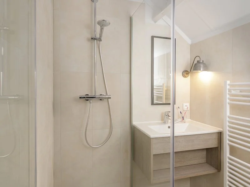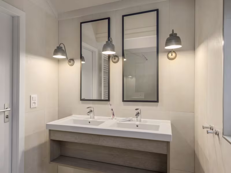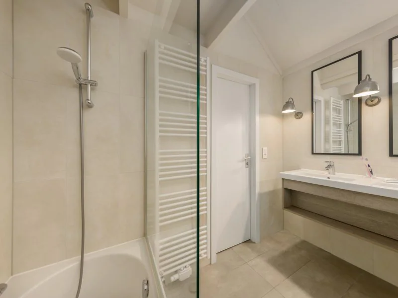 שני חדרי רחצה: חדר רחצה אחד עם מקלחון מקלחת גשם וכיור. חדר מקלחת נוסף עם אמבטיה, מייבש שיער, שירותים וחדר שירותים נוסף.
