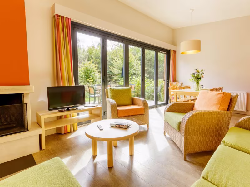 סלון עם טלוויזיה וחלונות גדולים הנפתחים למרפסת פרטית.