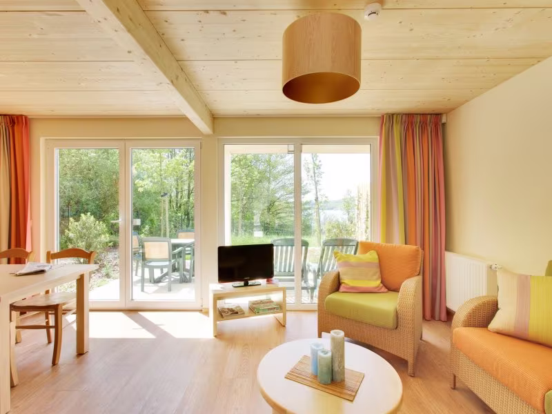 פינת ישיבה עם כניסה לחצר עם מספר כיסאות לישיבה לאורחים, טלוויזיה ורצפת עץ מעוצבת.