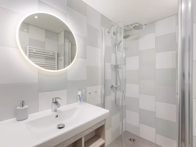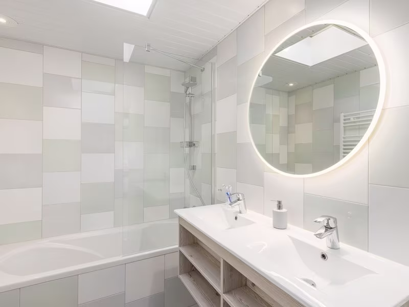 2 חדרי רחצה מחודשים: אחד עם אמבט ושירותים וחדר רחצה נוסף עם מקלחת ושירותים נפרדים.