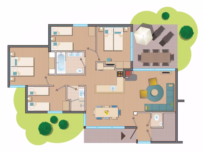 4 חדרי שינה מחודשים: 2 חדרים עם 2 מיטות יחיד מחוברות ומסך טלוויזיה באחד מחדרי השינה ו-2 חדרים נוספים עם 2 מיטות יחיד. בכל חדר ישנם שמיכות פוך, כריות, ומיטת תינוק.